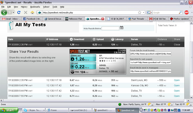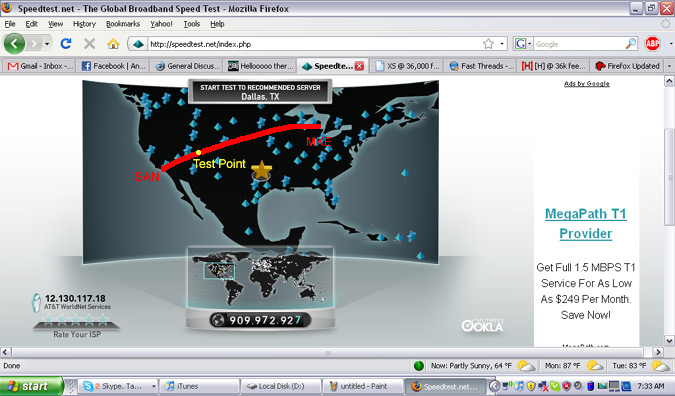 Of course, this was done once we reached the cruising altitude of 36,000 feet. Once up there, I did something that any self respecting geek would do – I went to speedtest.net. Actually, I ran 3 throughout the course of the flight. While in the air, I managed to post on a few forums, check my email, log onto IRC and AIM, and of course… browse Facebook. I tried to watch YouTube videos, but due to the lack of speed it was somewhat choppy.