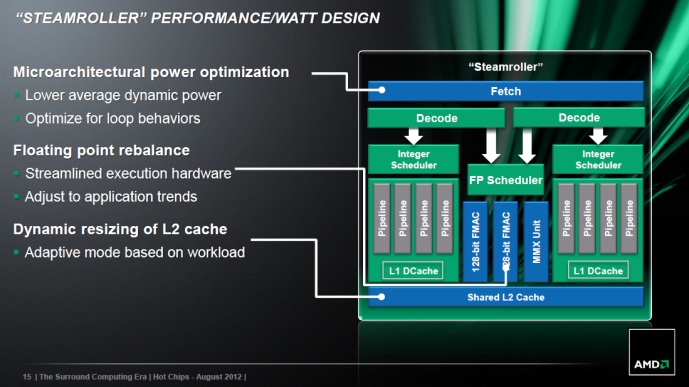 At the Hot Chips conference in August 2012, Mark Papermaster already gave a broad overview what Steamroller will be about (PDF download). AMD has learned from the performance drawbacks of Bulldozer and to a lesser degree Piledriver and tries to continually improve over the status quo. Back in 2011 when Bulldozer was launched, AMD laid out an ambitious performance roadmap, which promised some 10-15% performance improvement each year.