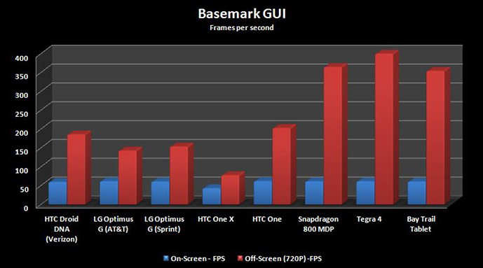 Next, we ran Basemark GUI, which is a Rightware Benchmark, designed to help users see how a certain SOC performs in Graphical User Interface scenarios. This is mostly a test of the GPU, but it also tests the smoothness of the experience and the overall frame rate. This benchmark has both an on-screen and off-screen test, and since most devices are limited to 60FPS, the off-screen test is more interesting than the on-screen test as a measure of overall GPU GUI performance.