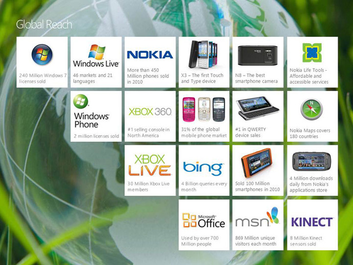 Will that be a strong enough ecosystem to take on Apple’s iTunes empire or Google’s cloud-everything Android approach? Only time will tell. But if Microsoft’s persistence and financial backing plus Nokia’s brand and global marketing are an indication, it’s a win-win. Global reach matters in this game and boy is Nokia an undisputed leader in this respect. The firm has sales channels and retails partners in the strangest places where Apple and Google will lack street presence for a long time. Another slide below, this one from Microsoft, summarizes the respective firm’s numbers and achievements to an easily digestible table.