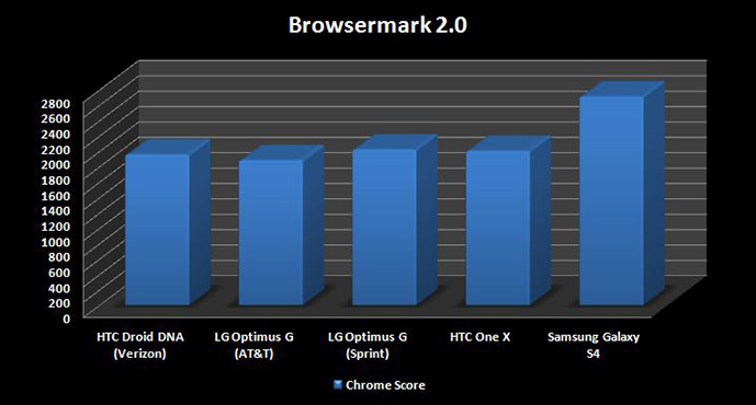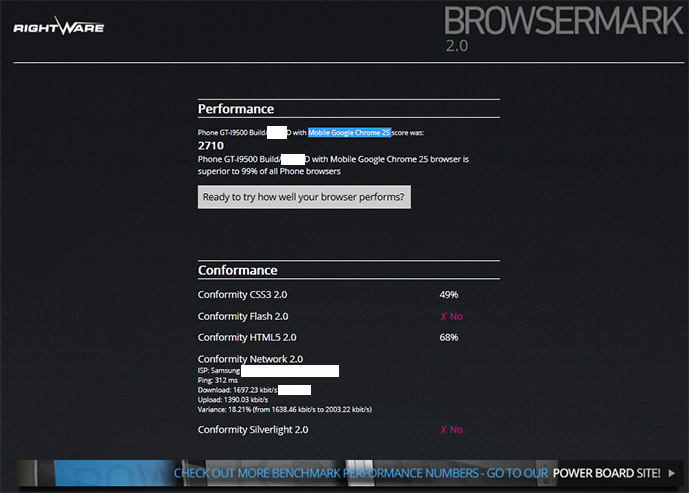 Now, the big question is how well will this Smartphone perform? Thanks to Power Board, an excellent online database from Rightware, we managed to find out. By accident, as it happens. We were running Browsermark 2.0 on several new devices which we are reviewing, when we stumbled upon Browsermark 2.0 results for the GT-I9500. This is an internal designation for the international version of Samsung Galaxy SIV phone. The phone was running Mobile Chrome Beta 25 (25.0.1364.122), achieving a great result of 2710. This is higher than my Acer Ultrabook powered by an Intel Core i7 dual-core ULV processor (2438), and better than the previous generation SIII. In this test, our Samsung Galaxy SIII (US Version, Powered by Qualcomm Snapdragon MSM8960) achieved a score of 1969. We also decided to include a comparison against some of the most recent Android phones we’ve tested (below).