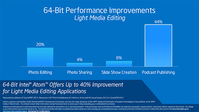 Following that, he wanted to focus on the improvements that going 64-bit had brought to the Intel architecture and how much of an improvement users could easily see from simply switching from a 32-bit SoC to a 64-bit one. Admittedly, the examples here are very media creation focused but it would be interesting to see them show more figures about daily usage and real-world applications. Sure they used TouchXPRT for the tests, but I believe that they could have used consumer-facing applications to do these measurements.