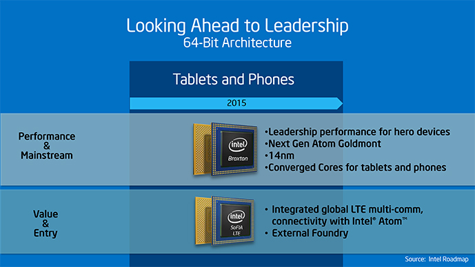 In addition to the 2014 roadmap, Hermann talked about the convergence of Intel’s Smartphone and Tablet SoCs (as seen above) in 2015. Intel expects to simply have a performance/mainstream offering and a value/entry offering for both their smartphones and tablets. Resulting in saved time and money in terms of engineering and development and shorter design cycles since two different products aren’t being made.