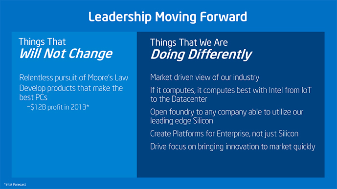 Intel’s CEO Brian Krzanich also talked about embracing where the market is going and to have a more pragmatic approach to creating products and a much less insular company. This will be fundamental change in the way that the company looks at their products and the markets that they address.