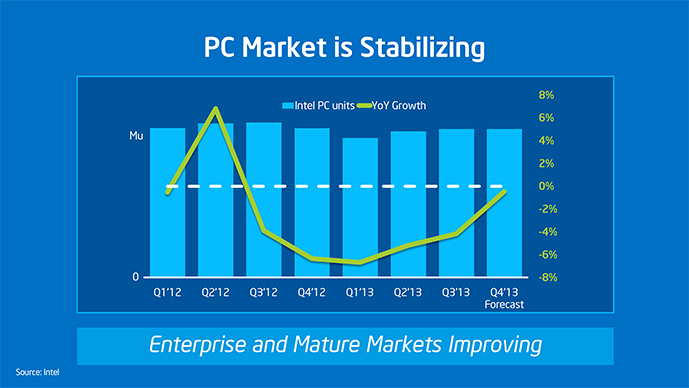 One of the important factors in today’s perspectives was the fact that the PC market has stabilized to a point where Intel can focus on other businesses while still maintaining profitability in the PC market. While many have claimed doom and gloom on the PC market, Intel has proven that they haven’t seen nearly as much volatility in the market as some of their competitors have. A stable PC market gives Intel an opportunity to expand on a more stable base without dismaying investors.