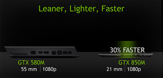 In addition to not only being cooler and more power efficient, the GTX 850M is also 30% faster than 2 generations ago (and a few process nodes). Nvidia is really showing us what Maxwell brings to the table here alone when you consider how significant of an improvement the Maxwell architecture has proven to be even without a process node shrink.