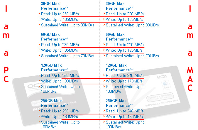 ArchivebotRecently, OCZ introduced its line-up of products for Apple platform, as we covered it in our news story. What was weird was the fact that the Vertex Mac Edition SSDs come with different speeds compared to its PC version. If you compare the PC Version of Vertex SSD to a Mac-certified one, you will see that unfortunately, Mac SSDs endured a spec-down by 10MB/s, both in the areas of read and write.
